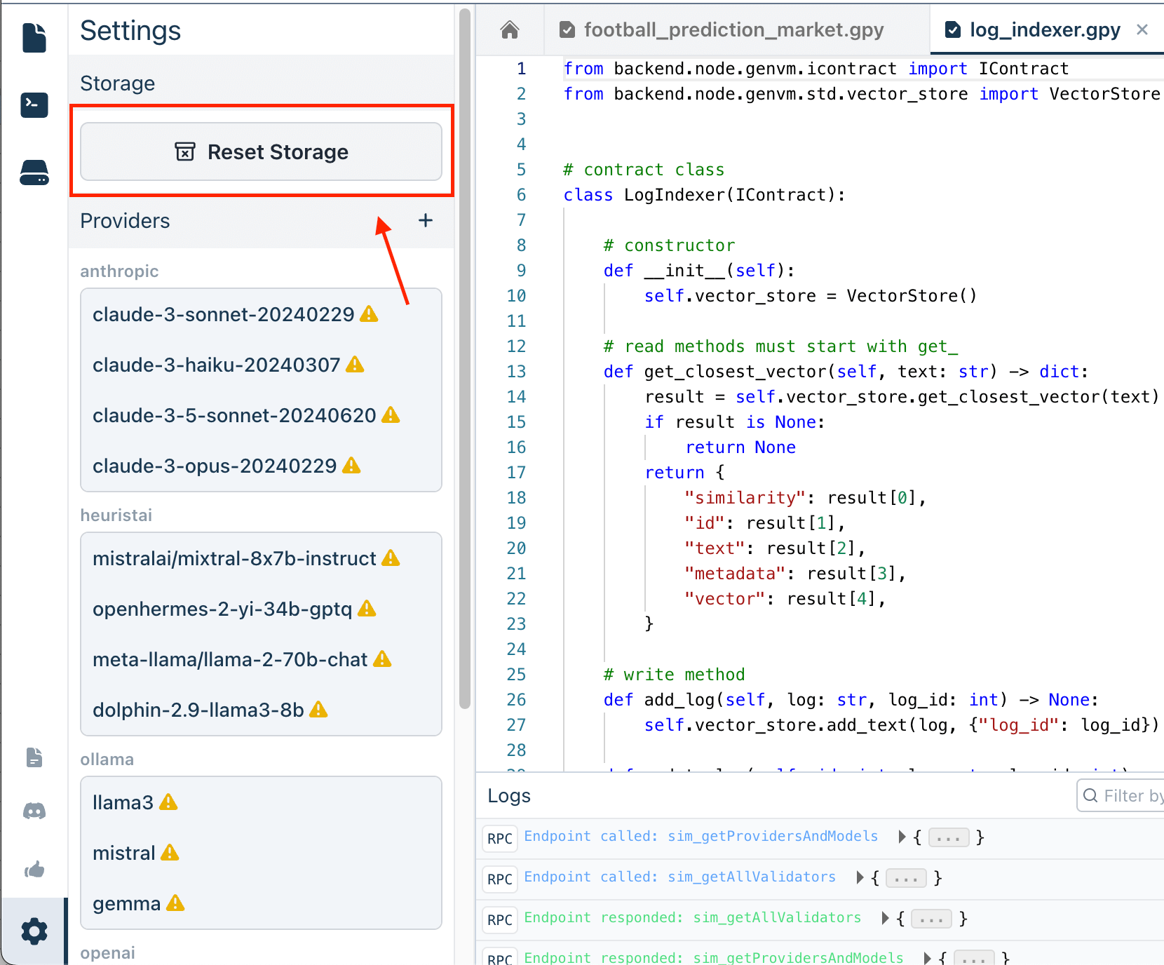 The GenLayer Studio provides a straightforward way to reset its storage, current status, memory, and contract examples. This feature is particularly useful if you want to start fresh with a clean state, whether you’re testing new contracts or simply clearing out previous configurations.